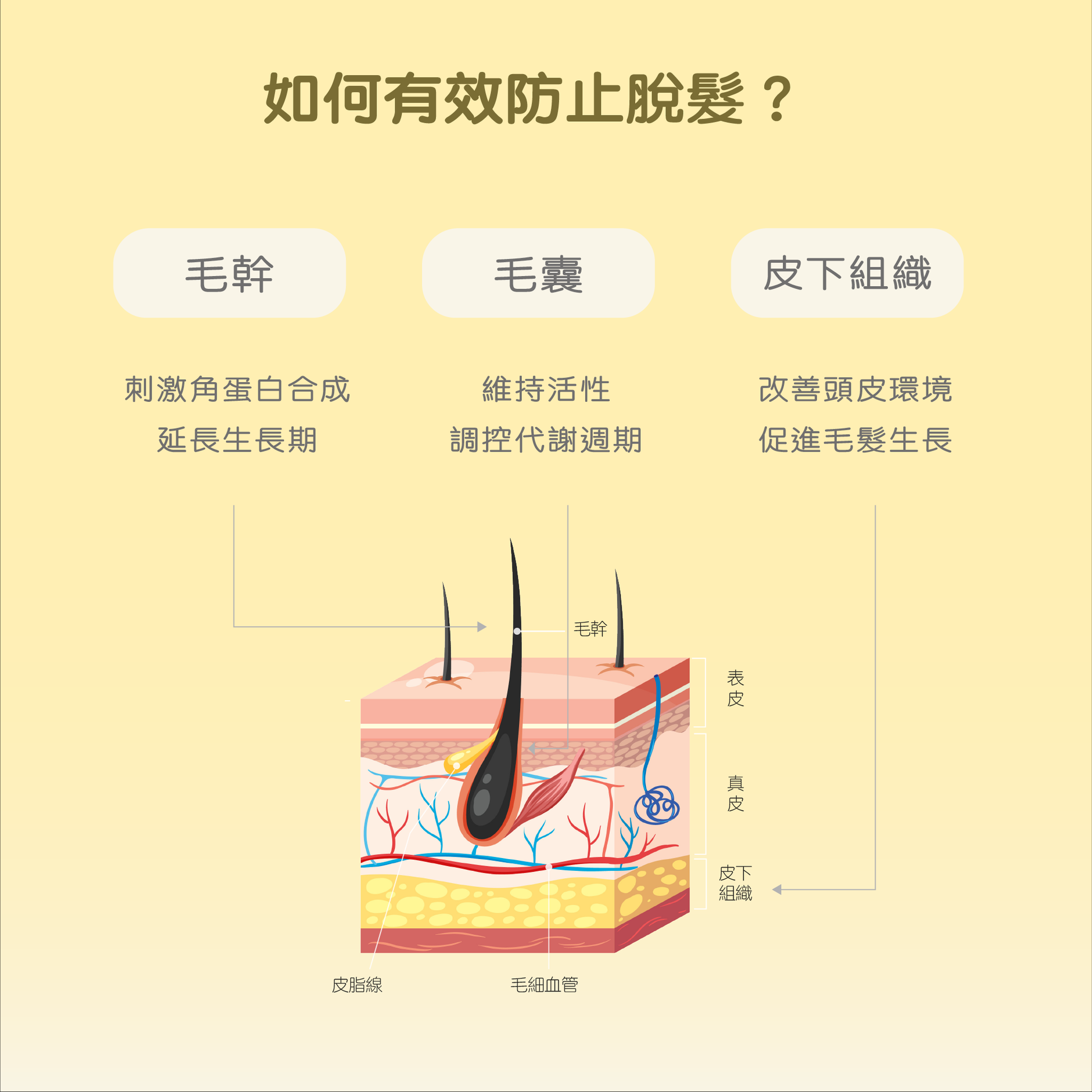 - 防止脫落:縮短毛囊休止期,調控細胞代謝週期以避免亞健康脫髮。