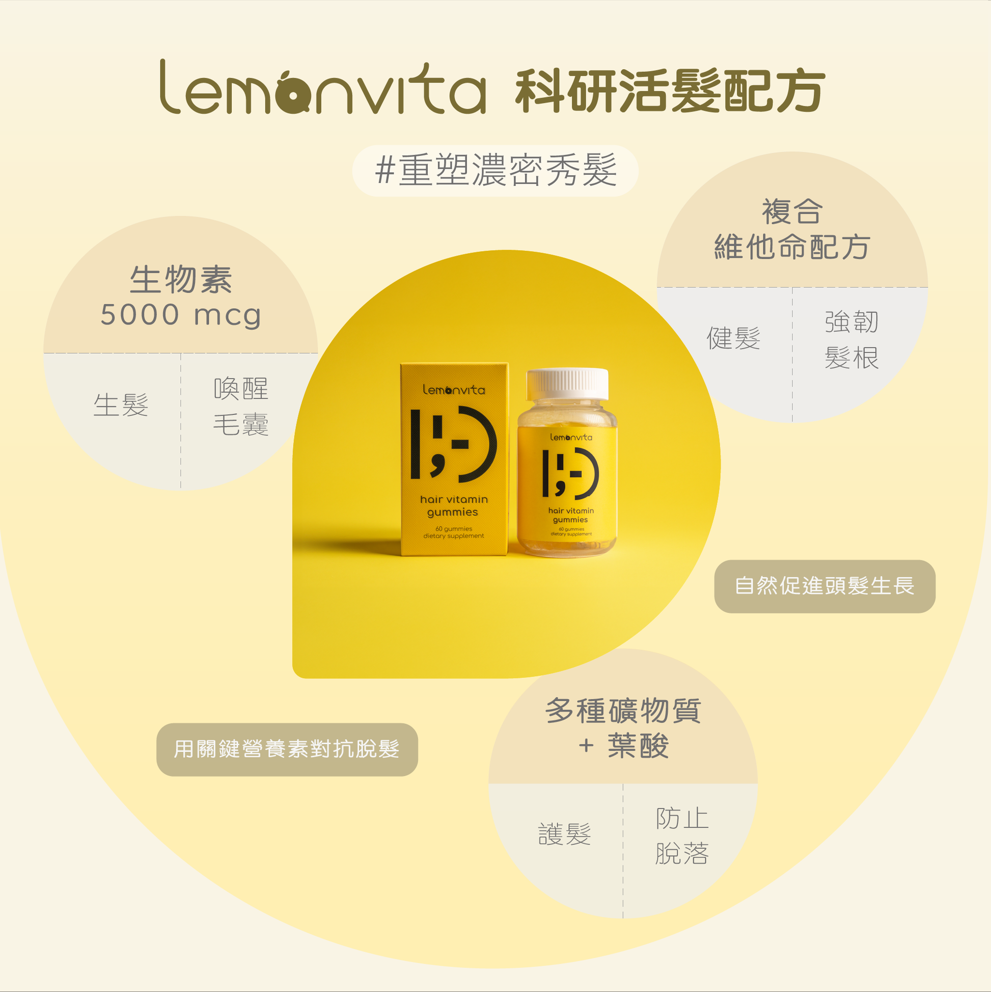 All-In-One的完美頭髮營養補充,針對毛囊生長週期所調配的【生物素:多種維他命:礦物質】最優比例,助你時刻保持健康活力的頭髮;美味的檸檬柑橘風味更使護髮成為舌尖的享受。