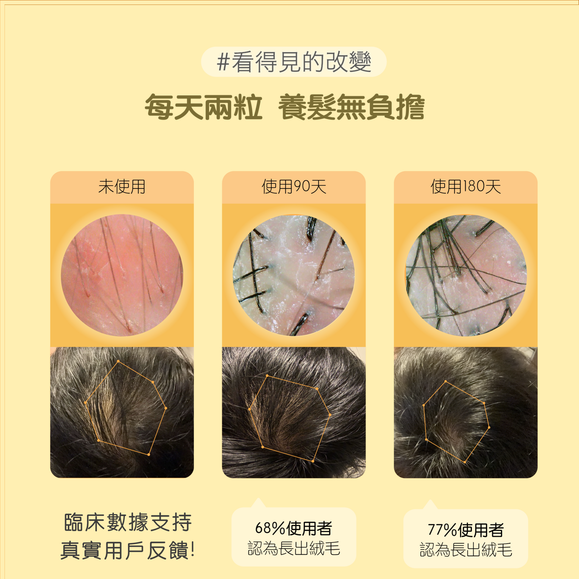 持之以恆,就能見證驚喜!大多數的夥伴們在2到6個月內看到了明顯的改善。考慮到頭皮細胞的代謝週期約為14-28天,我們建議持續使用6個月以上,讓秀髮煥發新生!